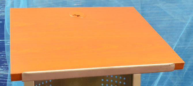 Laminated Wooden Top. Base made of powder coated grey steel base. Shelve and grommet holes for cord management.