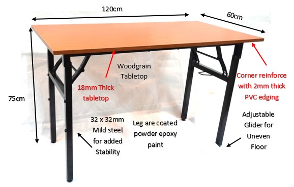 Table top are made of laminated high pressured board- 18mm. The edge is further reinforce with 2mm thk PVC flat edging. Suitable for use with table clip