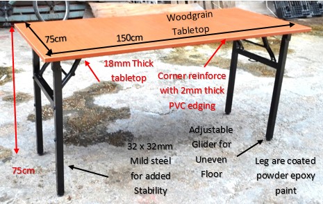 Table top are made of laminated high pressured board- 18mm. The edge is further reinforce with 2mm thk PVC flat edging. Suitable for use with table clip